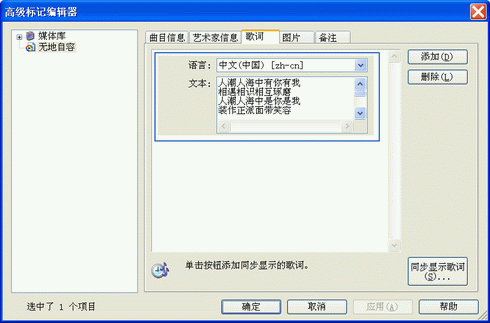 啟動(dòng)WMP 9.0后,首先要打開播放列表,點(diǎn)擊菜單“查看/正在播放選項(xiàng)/顯示播放列表”。選中你需要編輯歌詞的歌曲,選擇右鍵菜單中的“高級標(biāo)記編輯器”。在“高級標(biāo)記編輯器”中的“歌詞”項(xiàng),點(diǎn)擊“添加”按鈕。將“語言”設(shè)置成為“中文”,然后在文本框中輸入歌詞(如圖1)。
