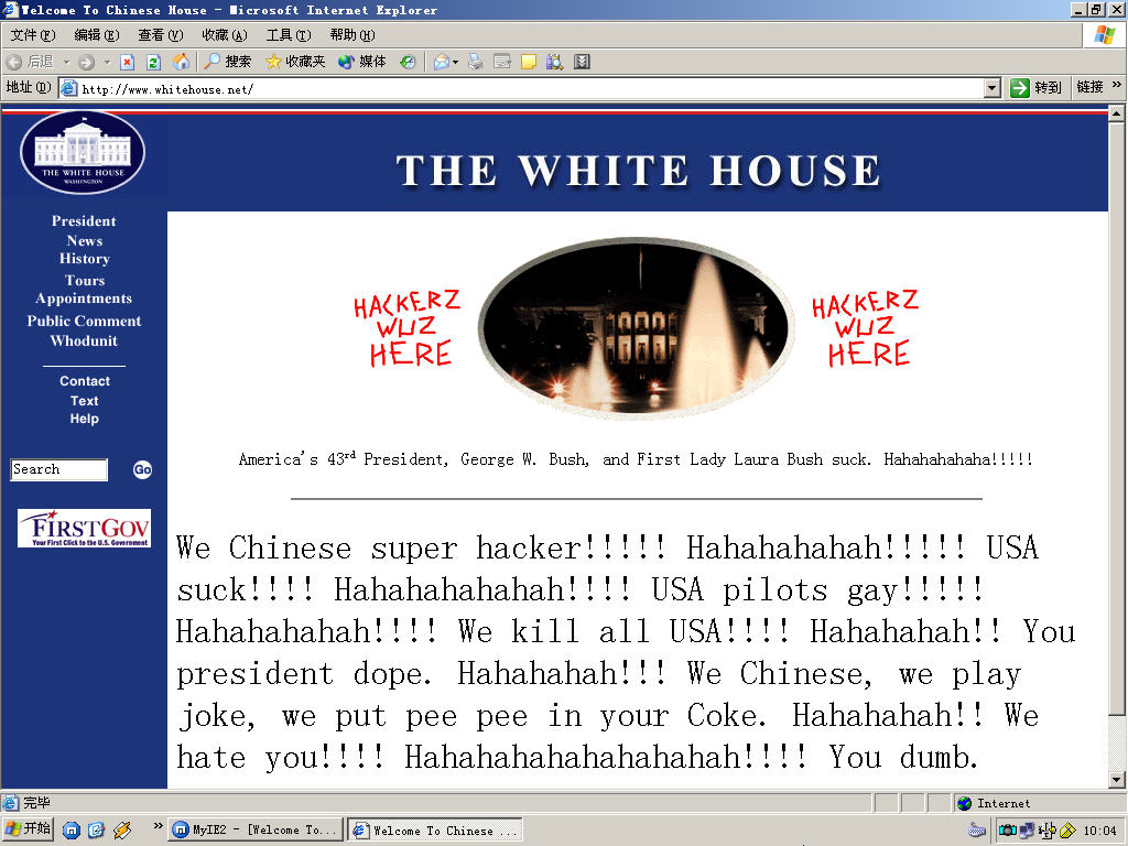 真實白宮的網站:http://www.whitehouse.gov 被攻擊白宮網站:http://www.whitehouse.net 色 情白宮網站:http://www.whitehouse.com 冒充白宮的網站:http://www.whitehouse.org www.whitehouse.net幾乎每年都要被中國黑客紅客攻擊,早在99年就因為中美南斯拉夫事件就被中國紅客們黑了,接著2000~2003年,每年都有黑客攻擊。要么寫上“大字報”,要么骷髏頭什么的。