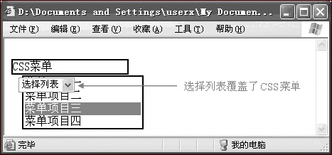 <div id="main" style="position:absolute;width:200px;"> <div id="menuBlock" class="menuBlock" onmouseover="showMenu();" onmouseout="hideMenu();">CSS菜單</div> <div id="subMenus" > <div id="0" onmouseover="setStyle(this)" onmouseout="setDefault(this)" >菜單項目一</div> <!--共四個菜單項目 --> </div><P> <select id="lb_1" name="lb_1"> <option value="-1"/>選擇列表 <!-- 三個選項 --> </select> </div> </body></html> 頁面的<STYLE>部分定義了三個樣式,分別用于菜單條、菜單項目、選擇列表,通過樣式定義保證菜單、選擇列表的顯示區域重疊。<BODY>部分包含菜單和<SELECT>選擇列表的定義。當鼠標經過菜單條時,JavaScript函數showMenu執行,顯示出菜單,同時隱藏SELECT選擇列表。鼠標離開后,hideMnu函數隱藏菜單,同時恢復選擇列表。其余幾個JavaScript函數主要用于模擬菜單動作,鼠標經過菜單項時以高亮度顯示菜單(setStyle函數),鼠標離開菜單項目時則將它恢復默認顯示形式(setDefault函數)。頁面的運行效果如圖二所示。將showMenu函數中的document.getElementById("lb_1").style.visibility="hidden"語句注釋掉就可以看到圖一的效果。 <descript> <img src=/cce/img/553/04601t02.jpg> </descript>