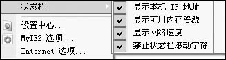 一直以來,不少網(wǎng)友都抱怨上網(wǎng)后不能及時掌握系統(tǒng)資源的變動情況(例如上網(wǎng)后的IP地址、剩余內(nèi)存、當(dāng)前網(wǎng)速等),從而更好地有的放矢。現(xiàn)在,在MyIE2的狀態(tài)欄上可以即時獲得這些信息:打開菜單“選項(xiàng)→狀態(tài)欄”后把全部可選項(xiàng)都勾選了(如圖2),相關(guān)信息就能一覽無遺。除了這些信息以外,你還可以通過狀態(tài)欄上的圖標(biāo)很方便地進(jìn)行設(shè)置廣告過濾、脫機(jī)瀏覽、啟用/禁用過濾、開啟簡易收集板等操作(如圖3)。