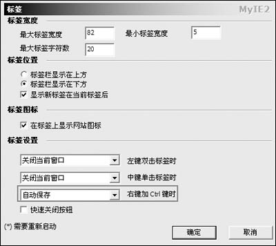 第一步,依次打開“選項(xiàng)→MyIE2選項(xiàng)→標(biāo)簽”窗口,在“標(biāo)簽設(shè)置”可看到當(dāng)鼠標(biāo)雙擊、中鍵單擊、Ctrl+右鍵點(diǎn)擊網(wǎng)頁標(biāo)簽時可以各自執(zhí)行不同的動作。把其中一種鼠標(biāo)點(diǎn)擊行為設(shè)為“自動保存”,在此建議選擇Ctrl+右鍵點(diǎn)擊方式(如圖4)。