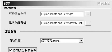 第二步,同樣在“MyIE2選項(xiàng)→保存”窗口,分別設(shè)置圖片和網(wǎng)頁文件的保存路徑并設(shè)置自動保存的文件類型。建議選擇“按站點(diǎn)分目錄保存”(如圖5),這樣日后查找起來比較方便些。