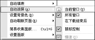 對于一些長長的網(wǎng)頁文本,閱讀時就只要不斷向下翻頁,總是讓人覺得不太方便。如果你喜歡在網(wǎng)上閱讀長篇小說,“自動滾屏”功能就一定助你一臂之力:首先在菜單“工具→自動滾屏”選擇對“當(dāng)前窗口”還是“全部窗口”執(zhí)行操作,再從三種(高速、中速、低速)不同的速度控制方式中選擇一種,勾選“鼠標(biāo)控制”(如圖6)。完成后只要鼠標(biāo)指向窗口右側(cè)的滾動欄上就能實(shí)現(xiàn)自動滾屏(由鼠標(biāo)的位置決定滾動方向和速度. 越靠下則滾動速度越快, 反之, 越往上則滾動速度越慢),當(dāng)鼠標(biāo)離開滾動條則停止?jié)L動。