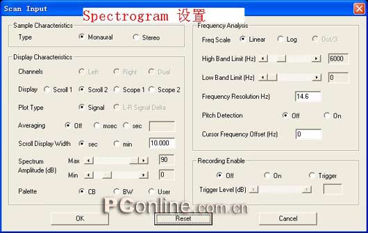 44 | 由于winamp增加了MP3Pro的插件,比foobar的表現更為細致,高音低音均比foobar更厚實,由于foobar沒有MP3Pro插件的支持,暫時輸給了更多插件支持的Winamp。 但是在MP3文件和APE文件上,foobar比winamp的音質效果的層次感更加分明。輸出噪聲也較winamp少,無論是在高音區還中低音區,音質都更這厚實。foobar的音頻解碼確實不俗。 在WAV的測試過程在,二者成績不相上下,很難分個上下。 但是winamp搭配了DFX之后,無論是在MP3文件還是在WAV文件的測試中,在保真度、3d環繞、音域方面都要比winamp和foobar好很多。可惜現在DFX還不支持foobar。 耳聽無憑,眼見為實。頻譜分析方面我們采用了專業的頻譜分析軟件——Spectrogram V8.8,設置如下: