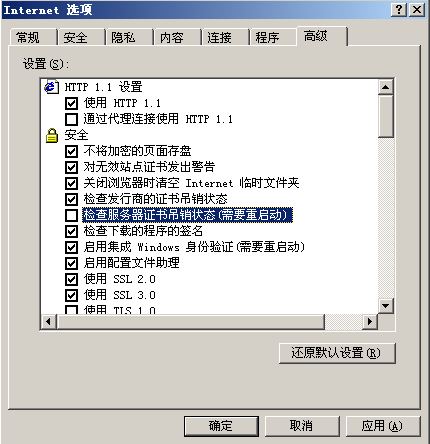 5.檢查 IE 安全設(shè)定:打開(kāi)Internet Explorer瀏覽器,按工具菜單,選擇“Internet 選項(xiàng)”,選擇“高級(jí)”,拖動(dòng)滾動(dòng)條到安全選區(qū),證實(shí)“檢查服務(wù)器證書(shū)吊銷”沒(méi)有被選中,同時(shí)證實(shí)“使用 SSL 2.0”和“使用 SSL 3.0”被選中。然后按“確定”。