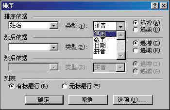 將Word表格中需要排序的某一列(如姓名)先輸入好,每個姓名要單獨占一行,單擊“表格”菜單中的“排序”命令。在彈出的“排序”對話框里,在“排序依據”項選擇“姓名”,“類型”選項默認為“拼音”,單擊其右側下拉列表,選擇“筆畫”(如圖1),在其后的單選框里選擇“遞增”或者“遞減”方式,單擊[確定]即可。