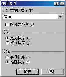 其實我們可以使用Excel“數據”菜單中的“排序”命令來實現這一操作。該命令一般情況下用來對多個字段同時進行排序操作(最多允許三個字段),另外該命令還允許對“自定義序列”和“文字筆畫”進行排序操作。單擊表格中需要排序字段的任一單元格,打開“數據”菜單中的“排序”命令,彈出“排序”對話框。若要按升序排序,在“主要關鍵字”類型中選擇該字段(如圖2),在其右側的單選框中選擇“遞增”。單擊[選項]按鈕,打開“排序選項”對話框,選中“方法”中的“筆畫排序”單選框(如圖3),單擊[確定]按鈕,返回。再次單擊[確定]按鈕則完成了字段的排序操作。