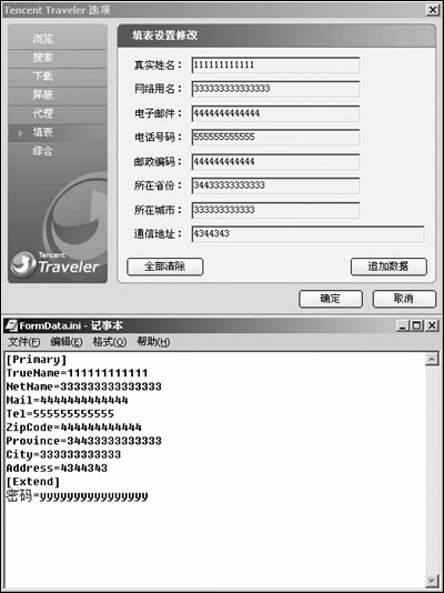 安全問題描述 一般來說,我們使用自動填寫表單功能,是為了能快速地填寫一些申請表。經過對騰訊TT的仔細分析,我們發現騰訊TT竟然將表單的數據全部以明文的形式寫在騰訊TT安裝文件夾根目錄的FormData.ini文件里,只要用普通的記事本打開該文件,用戶的信息就會一覽無遺!如圖2所示。
