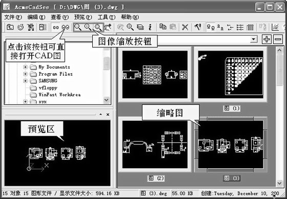 Acme CADSee是CAD圖形文件的專用瀏覽器,它支持AutoCAD 2002以下版本的DWG和DXF文件。它的主界面和ACDSee非常相似,操作方式也幾乎如出一轍。我們只要在左上方的文件夾列表中選擇某個文件夾,在右側窗口中就能看到以縮略圖形式顯示的CAD文件。如果覺得通過縮略圖不容易確定要查找的文件,可以在左下方的預覽區內對選中的文件進行預覽(圖1)。
