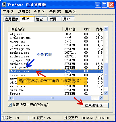 注意:有兩個名字叫"Taskmgr.exe"進程,一個是QQ病毒,一個是你剛才打開的"Window 認為管理器"
