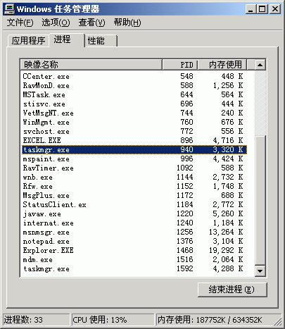 要想徹底清除該病毒,應該先清除內(nèi)存中的病毒進程,如果操作系統(tǒng)是WIN2000以上的用戶,可以按CTRL+SHIRT+ESC打開任務管理器,然后在內(nèi)存中查找名為“TASKMGR”的進程,找到后直接將它結(jié)束。要記住,該進程名和任務管理器名字一樣,用戶要注意分辨,如果用戶不確定,就看看內(nèi)存占用大小,內(nèi)存占用小的就是病毒進程了。如果是WIN9X的用戶,則只能用一些第三方的進程查看軟件,如procview等來清除了。(如圖:)