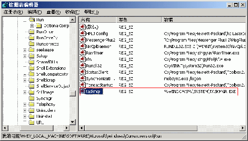 該病毒會在電腦的注冊表HKEY_LOCAL_MACHINE\Software\Microsoft\Windows\Currentversion\Run中建立名為“taskmgr”,內(nèi)容為“%WINDOWS%\SYSTEM\TASKMGR.EXE”的健值,為了防止病毒下次系統(tǒng)啟動時自動運行,用戶應該將該鍵值刪除,方法是在“運行”菜單中鍵入“REGEDIT”(如圖:)