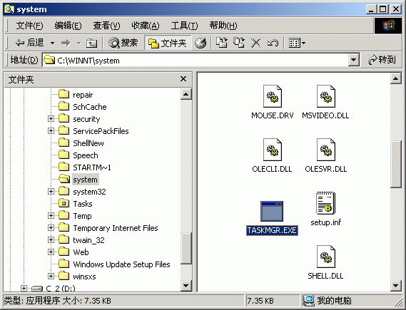 該病毒運行時,還會將自身拷貝到操作系統(tǒng)安裝目錄中的SYSTEM目錄中,并命名為TASKMGR.EXE,請注意正常的任務管理器的文件名也是這個,但是存在于操作系統(tǒng)安裝目錄的SYSTEM32目錄中,用戶要注意分辨。(如圖:)