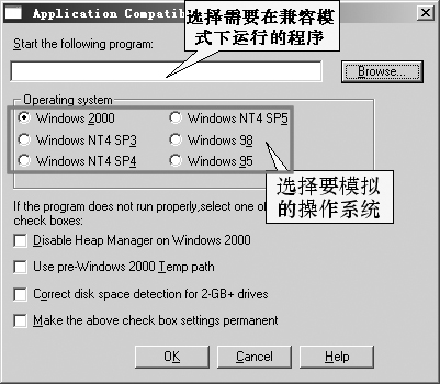 小技巧:如果將Apcompat.exe文件拷貝到系統文件夾下(C:\WINNT),我們便可以通過“開始→運行”來調用該文件了。