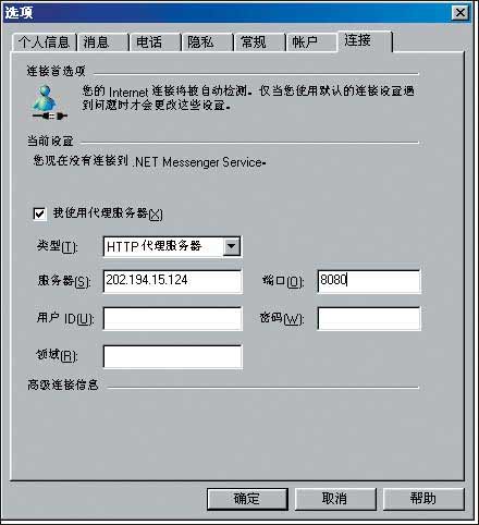 目前,不少大學都通過教育網接入Internet。出于費用方面的考慮,學校一般都不會開放訪問國際網的功能,因此,深受大家喜愛的MSN聊天軟件也就無法使用了。最近,微軟給出了MSN的官方教育網代理地址:202.194.15.124:8080,可以幫助以上無法訪問國際網的用戶開通MSN。因為這是微軟所提供的官方代理地址,速度和時效性方面應該有保證。打開MSN,點擊“工具”菜單下的“選項”,再選擇“連接”標簽,在“我使用代理服務器”前打上勾,在“類型”中選“HTTP代理服務器”,“服務器”一欄中填入202.194.15.124,“端口”中填入8080(圖1)。填完后點擊[確定]按鈕使之生效。現在,你就可以在教育網內輕松地使用MSN和各路好友神聊上一番了。