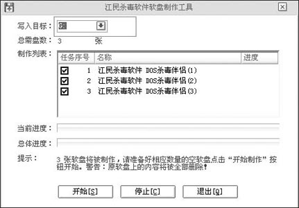 在KV2004主界面中選擇“工具→制作DOS殺毒盤”,連接U盤后,如圖所示把“寫入目標”中的盤符改為U盤的盤符,制作的過程非常快捷,中途也無需進行任何操作。
