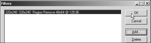點(diǎn)擊“Video→Filters”進(jìn)入插件選項(xiàng),按Add添加濾鏡插件,如果插件比較多下拉找到“Region Remove”,添加成功OK后將會(huì)出現(xiàn)352×288 352×288 Region remove 57×70@141.116字樣,顯示的是源文件的畫(huà)面大小等一些信息。