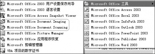 第一步 我們需要安裝“Microsoft Office Document Imaging”的組件,點“開始→程序”,在 “Microsoft Office 工具” 里點“ Microsoft Office Document Imaging” 即可安裝運行(如圖1所示)。