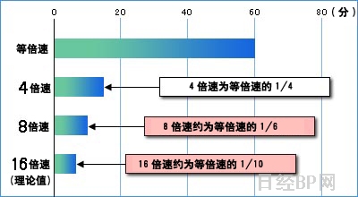 由于這樣以來并不是以8倍速寫入整個盤片,因此就不能根據規格中標注的速度按比例計算縮短的時間。如果是16倍速的話,實際上能以最高速度寫入的區域比8倍速還要小。