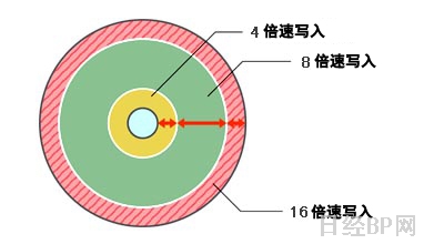 | ▲ 為了將盤片的旋轉次數控制在毎分1萬轉之內,需要根據盤片的寫入 位置分別調整速度。只有最外圈為16倍速寫入 |