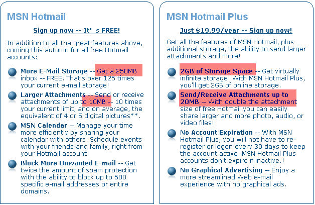 如圖,擴容計劃包括,免費信箱擴容至250兆,10兆附件;收費信箱擴容至2G,附件20兆。看來前幾天我們所能申請的“免費”的2G郵箱顯然是MSN的一個BUG所致了!希望微軟不會把已經申請的郵箱收回,呵呵。