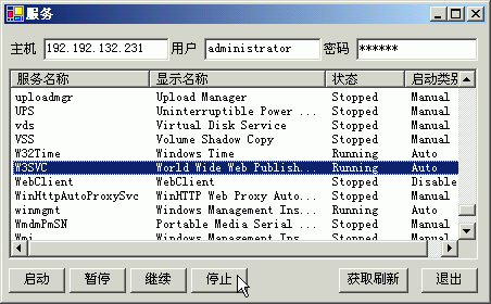總結,通過引用System.Management命名空間,上面簡單的實現了通過訪問\root\cimv2:Win32_Service名稱空間對服務進行顯示和操作。此外,我們還可以通過訪問其他名稱空間來訪問計算機的一些硬件信息,軟件信息以及網絡等,有興趣的讀者可以研究一下。