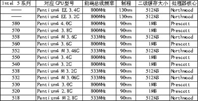 由表一我們可以看到,Intel “5”系列處理器都代表原來的”Pentium4”系列;其中大家需要注意的是代號558、552、538、532以及518這5款處理器,它們都是高頻Pentium4M(P4移動版)處理器,大家在選購時應注意區分。接著我們看看Intel的 “3”系列處理器命名規則,見表二,這對那些入門級的用戶有很高的參考價值。