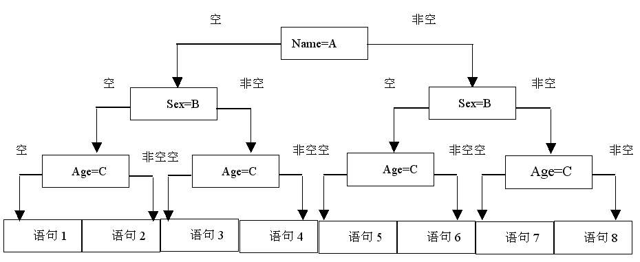 其中條件A、B、C之間是與的關系,A、B、C均為動態選擇,可以取其中的一個、兩個或三個,也可以一個都不選,當三個條件都不選擇時則認為是無條件查詢,按照通常的做法,判斷方法如圖2所示: